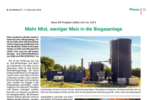 Ziel des Projekts war es, Gülle und Mist bereits vor oder während des Biogasprozesses so aufzubereiten, dass dem Substrat möglichst effektiv Stickstoff, Phosphor und Wasser entzogen werden. Dadurch sollte der Einsatz von Gülle und Mist in Biogasanlagen gesteigert und gleichzeitig der Maisanteil reduziert werden. Zudem war vorgesehen, durch die Aufbereitung gezielt definierte, pflanzenbaulich nutzbare Düngeprodukte zu gewinnen.