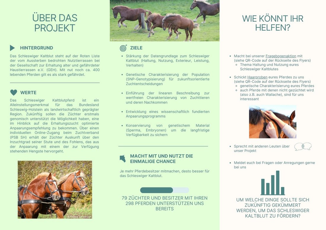 - Unterstützung der Züchterinnen und Züchter von Schleswiger Kaltblutpferden durch ein wissenschaftlich fundiertes Anpaarungsprogramm, das ermöglicht, wichtige Rasseeigenschaften und die genetische Vielfalt in Zuchtentscheidungen einfließen zu lassen